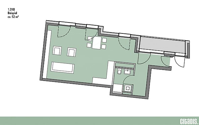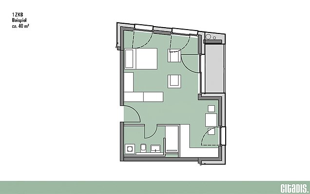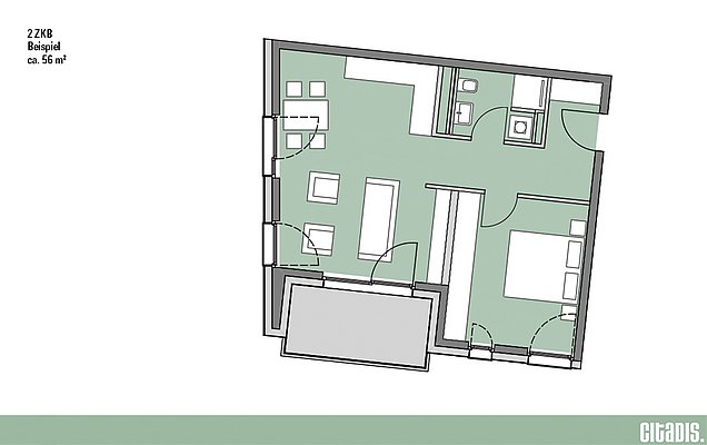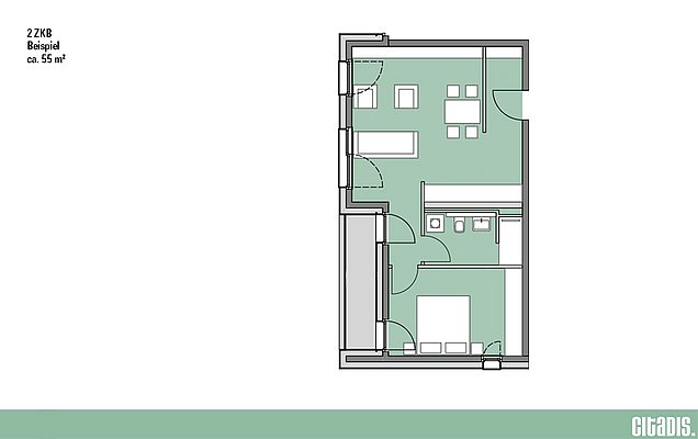 Zwei Zimmer, Küche, Bad – hier überzeugt nicht nur die Aufteilung der Räumlichkeiten, sondern auch die Topausstattung. Ab 46 m² groß sind die 2-Zimmer-Wohnungen in Citadis. Das moderne Bad mit bodengleichen Duschen, Echtholzparkett und die stylischen, zeitlosen Einbauküchen in den Wohnungen bis 70 m² runden das Wohnerlebnis ab. Die Loggien oder Balkone sorgen für Licht und Luft und bieten Wohnraum, der zum Entspannen einlädt.